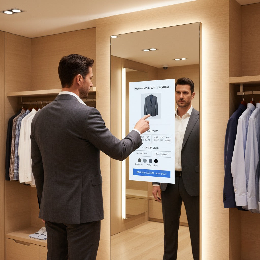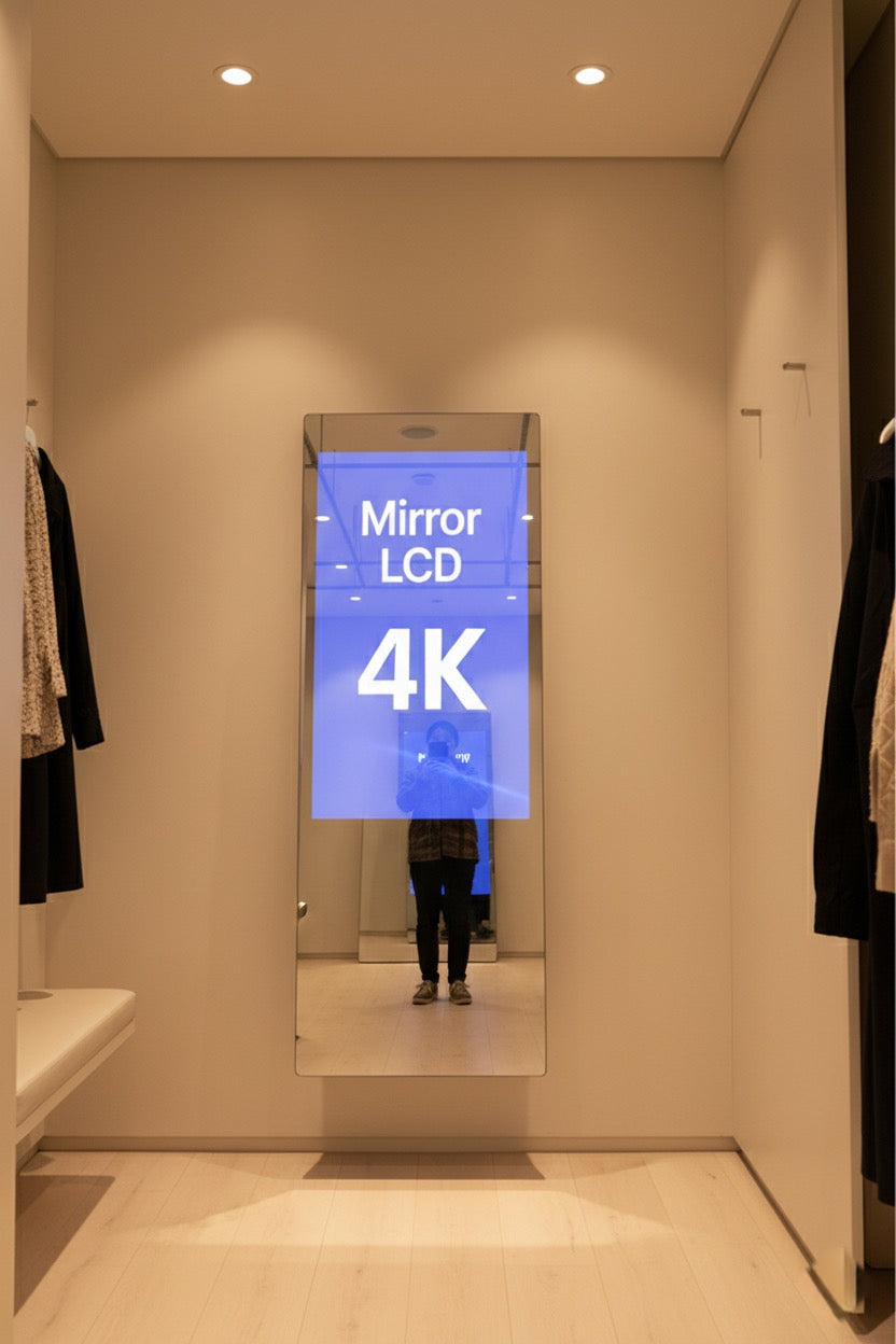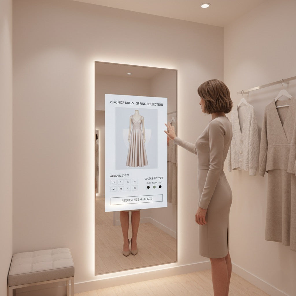The MERO 32 Interactive Mirror Display is designed to revolutionize fitting rooms by integrating advanced interactive technology with sleek, modern design. This state-of-the-art display enhances customer engagement and provides a seamless shopping experience.